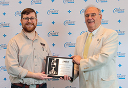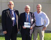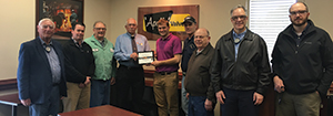 Mark Suer (left) and Andy Pinskey (right) presented a plaque of appreciation to Dave Sphar (center), president of IGS Industries.