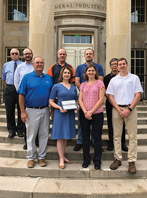 Specialty Alloy & Foundry Technology Committee (SAFTC) papers chair Rich Smith presented a plaque of appreciation to Chris Smith, Nucor Steel Birmingham Inc., for hosting the SAFTC’s tour on 23 March 2022 (left to right): Kevin Farrell, Caelen Kennedy, Rich Smith, Chris Smith, Andrew Pinskey, Nathan Engstrom and Louis Pignotti.