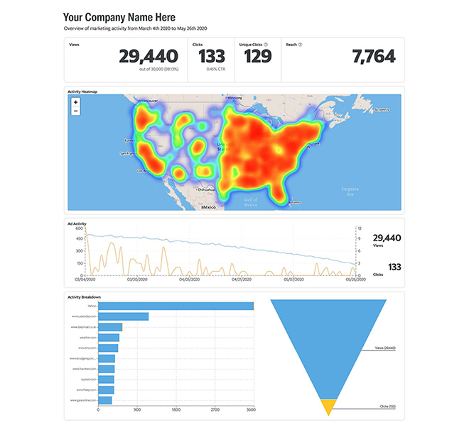 | Quantifiable ResultsAdvertisers will receive access to a detailed online dashboard to see campaign results in real time, including impressions, clicks and geographic locations of ads served. |
