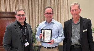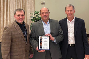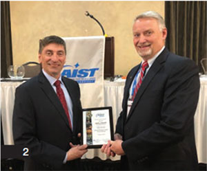 1. Detroit Member Chapter vice chair Scott Bishop (center), U. S. Steel – Great Lakes Works, presented plaques of appreciation to Christopher Hessler (left) and Lindsey Erb (right), Gerdau Special Steel North America, at the chapter’s 23 February 2023 meeting. 2. Midwest Member Chapter chair Ted Vrehas (left), Graycor Industrial Constructors Inc., presented a plaque of appreciation to 2022–2023 AIST president Keith Howell (right), ArcelorMittal North America, for his keynote address at the chapter’s dinner meeting on 15 February 2023. | |